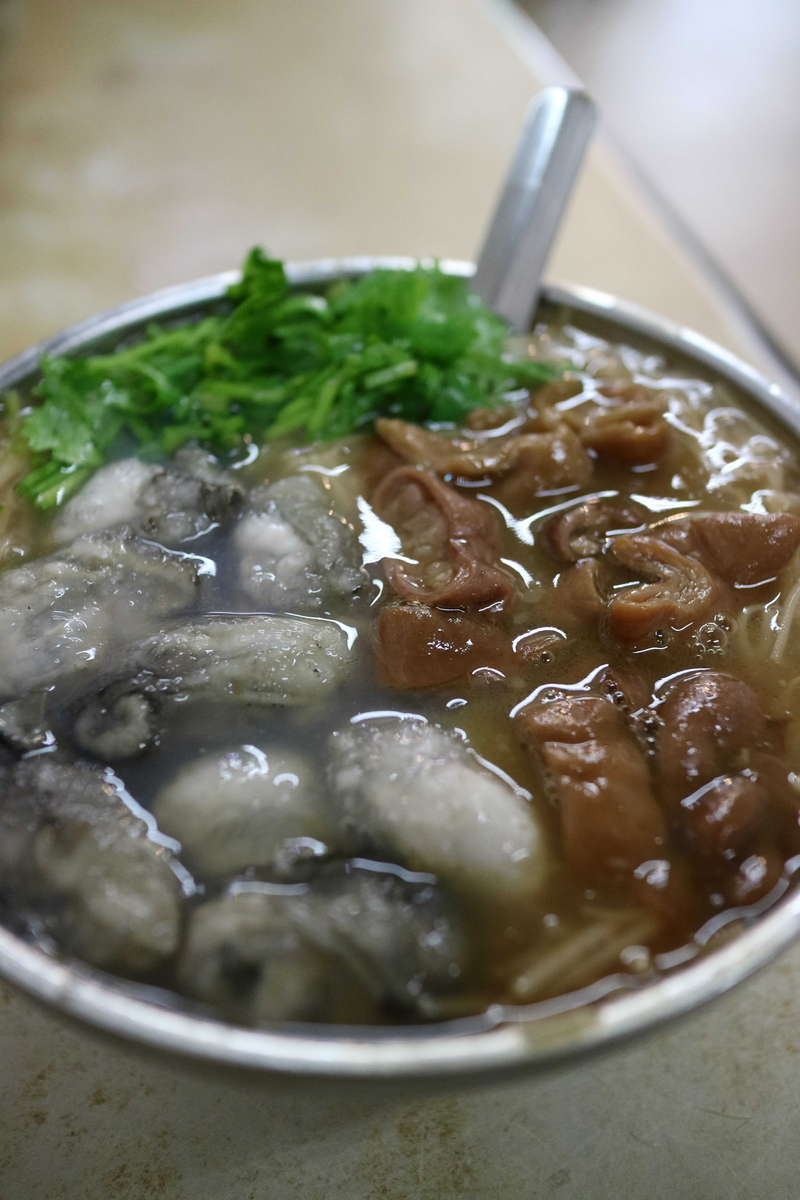 満席だったので少しだけお店の前で待つことになったがすぐに案内してくれた。総合(全部入り)の麺線を注文。牡蠣とモツと、メインを張れる具材が両方入った欲張りメニューなのだが料金は牡蠣100%ともモツ100%とも変わらずの80元というお得さ。すぐに運ばれてきた。まず見た目がいい。美しいと言ってもいいと思う。牡蠣とモツがおよそ半々の割合で表面に浮かび、その横に緑が鮮やかなパクチーが添えられている(注文時に店員さんから「パクチー入れますか?」と聞かれた。なので、もし嫌いなら断ることもできる)