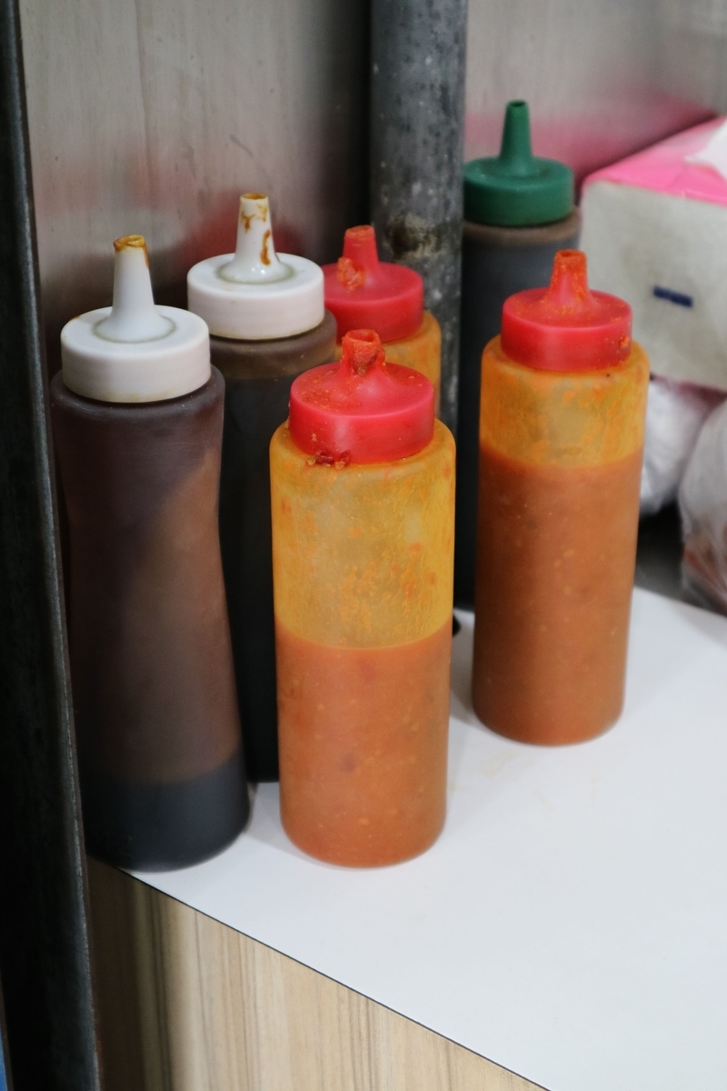 店員さんが小袋入りの辛そうなソースを「使うかい?」という感じで聞いてくれたので一応もらってはみたものの、やっぱり辛そうだったので結局使わなかった。その代わりに店頭に置いてあったソース(油醤か?)を前のお客さんの真似をして蘿蔔絲餅にかけてみることにした