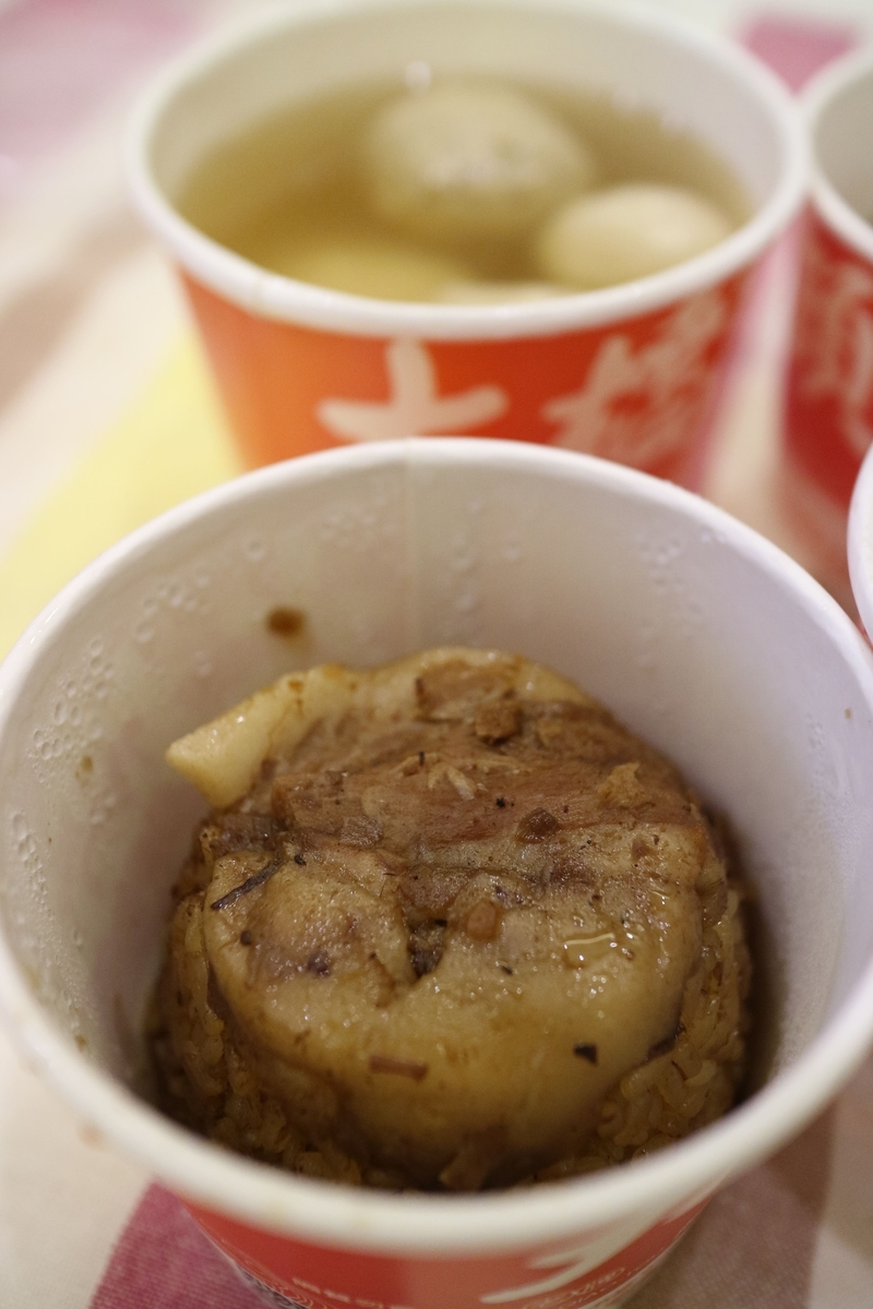 結論を言ってしまうと非常に美味しい。そもそも僕はおこわ類が好きなのだが味付けが日本人好みだと思う。乗せられている肉は2種類から選べるようになっている。「肥」と「痩」。文字からイメージしやすいのだが前者は脂身が入った肉、後者は脂身が入っていない肉。そして珍しくスープも注文してみたのだがこれもとても味がいい。具になっている貢丸や魚丸もふっくらしていてかみ切りやすいし味がいい。食べ終わったそばからまた食べたいなと思う料理だった